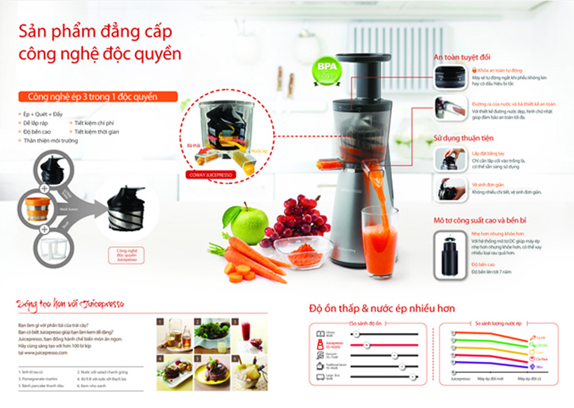 - Với thiết kế đặc biệt động cơ của Coway nhẹ nhưng hiệu suất mạnh mẽ không chỉ không gây tiếng ồn trong khi hoạt động mà ngoài ép trái cây bạn có thể ép thịt hoặc rau.